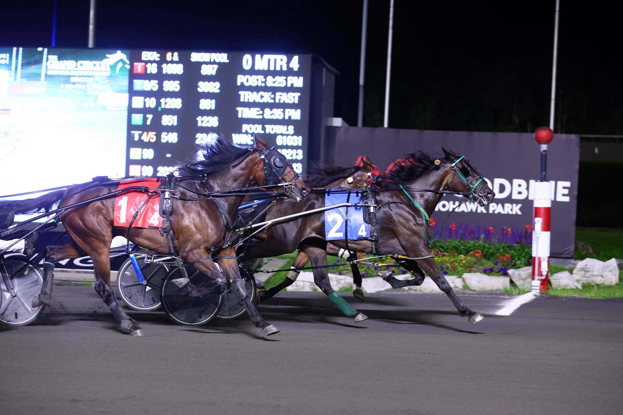 MILTON, September 2, 2023 — Sophomore trotting filly Climb The Pole and sophomore trotting gelding Gaines Hanover came with late accelerations to each capture their respective division of Simcoe Stakes at Woodbine Mohawk Park on Saturday night. Climb The Pole lunged in the closing strides to collar tempo-setter and 4-5 favourite Righteous Resolve to snag the $157,200 Simcoe for three-year-old trotting fillies in 1:52.2. Righteous Resolve revved off the wings and claimed command to a :26.3 first quarter with HP Extra Ice securing the pocket. Strolling firmly up the backside to a :55.3 half, Righteous Resolve stayed on the muscle through the final turn as HP Extra Ice readied a charge from the pocket. But after three-quarters in 1:24, Righteous Resolve kicked for home on an extended lead. Driver Jody Jamieson perched Climb The Pole on cover spinning into the stretch and launched her past HP Extra Ice with Baroness Hill rallying wider. Righteous Resolve stayed resolute on the point until the final eighth, where driver James MacDonald called upon her to engage with her late-rallying challengers. Climb The Pole hit another gear in the closing strides to down Righteous Resolve by a half length with Baroness Hill settling for third and Smashin Racquets another six lengths behind in fourth. Climb The Pole and driver Jody Jamieson winning the Simcoe Stakes for 3-year-old fillies on September 2, 2023 at Woodbine Mohawk Park (New Image Media) “She just tries; she never gives up,” said Jody Jamieson, who co-owns Climb The Pole with trainer Carl Jamieson, Steve Heimbecker and Aaron Byron. “She’s just a sweetheart, really. She’s an ornery mare sometimes, but when you get a racehorse like her and she tries every week… you can’t beat that.” A daughter of Kadabra, Climb The Pole continues to add to a productive campaign off a two-year-old season where she only started twice. She’s now won seven races from 12 starts in her career and banked $295,468. Off the second choice in the betting, she paid $5.30 to win. Gaines Hanover gobbled rivals down the center of the track while avoiding late-stretch trouble to take the $177,300 Simcoe for trotting sophomores in 1:53.1. Hasty Bid hustled to the lead to a :28 first quarter and soon yielded control to Osceola into the backstretch. Ghostly Casper, parked through the first turn, advanced towards the leader to a :56 half. Osceola kept him wide to the final turn as Ghostly Casper continued pestering the pacesetter to three-quarters in 1:24.1 all while Southwind Coors readied a three-wide charge and Gaines Hanover a four-wide charge. Osceola swung for home clinging to the lead as Hasty Bid looked for clearance to pull from the pocket. Southwind Coors and Gaines Hanover gathered their momentum on the straightaway and marched furiously after the leader while Hasty Bid got hooked by the wheels of a tiring Ghostly Casper in the last eighth. Gaines Hanover outmuscled Southwind Coors to the beam to take a neck victory with Osceola third and 130-1 shot New Rules grabbing fourth. Gaines Hanover and driver Sylvain Filion winning the Simcoe Stakes on September 2, 2023 at Woodbine Mohawk Park (New Image Media) “I’ve raced against him so many times and I was real happy to get the drive on this guy for this race here,” said driver Sylvain Filion on acquiring the drive behind the Richard Moreau trainee since regular pilot Louis-Philippe Roy opted to drive Tuscan Prince, who broke behind the gate. “I thought it was the only way to go – I floated out of there and got cover. Even though I never saw pylons, he swelled up around the last turn and he just wanted to go so much. He tries so hard.” Gaines Hanover, a gelding by Cantab Hall and a winner at Woodbine Mohawk Park last year in the $810,000 Breeders Crown Two-Year-Old Colt and Gelding Trot, has now collected six victories from 16 starts and earned $666,236 for owner Gestion J. Y. Blais Inc. He paid $13.50 to win. By Ray Cotolo, for Woodbine Communications Watch the race replays here: Share This:Share