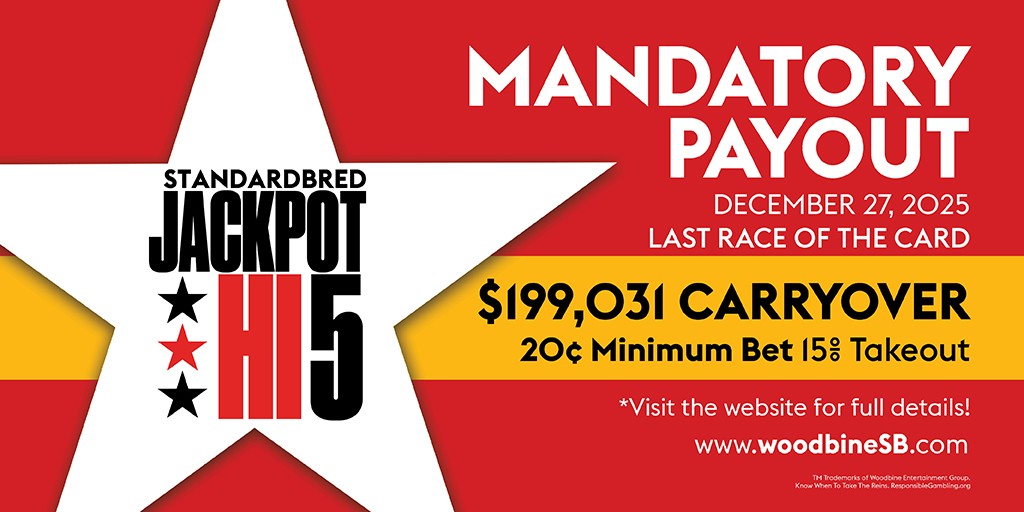 MILTON, December 23, 2025 – Woodbine Mohawk Park’s Boxing Day matinee on Friday is now set to feature carryovers for both the Early Pick-5 and Pick-6. Horseplayers will want to set a reminder of the special 1 p.m. post time for Friday’s card, as Race 1 will start the Early Pick-5 with a carryover of $53,161. The carryover came into play after there were no winning tickets on the Mid Pick-5 Monday evening. The $53,161 carryover will have horseplayers all over taking a crack at the Early Pick-5, which features a $0.20 minimum and 15 per cent takeout. The Pick-6 also had no winning tickets on Monday night. Friday’s Pick-6 starts in Race 4 and will have a carryover of $7,022. It also features a $0.20 minimum and 15 per cent takeout. Friday’s Boxing Day matinee has 11 races scheduled with a quartet of featured races. Race 2 – $40,000 Free For All Trot Race 6 – $33,000 Niagara Pacing Series Final Race 8 – $34,200 Valedictory Pacing Series Final Race 9 – $40,000 Free For All Pace To download a free program, click here. The card following Boxing Day will also be notable for horseplayers, as Saturday’s (December 27) 12-race program is highlighted by a mandatory payout for the Jackpot Hi-5. Monday night was the final chance to play the Jackpot Hi-5 ahead of the mandatory payout and again saw multiple winning tickets. The carryover for Saturday’s Jackpot Hi-5 mandatory payout is $199,031.68. The Hi-5 has a $0.20 minimum and 15 per cent takeout. The Jackpot Hi-5 mandatory payout race is carded as Race 12 (10:58 p.m.) with an overflow field of 12 to compete. Post time for Saturday’s card is 6:35 p.m. For more information on live racing at Woodbine Mohawk Park, visit Woodbine.com/Mohawk or follow @WoodbineSB and @WoodbineComms on X. Share This:Share