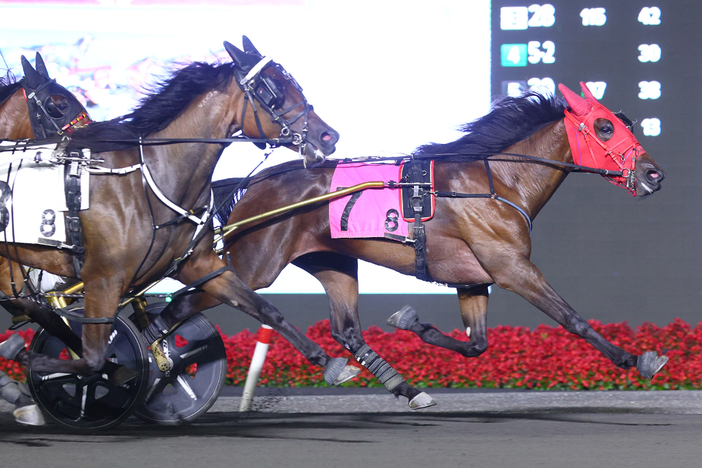 MILTON, September 13, 2024 – Trainer Blake MacIntosh led the way with winners in two of Friday’s three Champlain Stakes at Woodbine Mohawk Park. The MacIntosh stable swept both divisions of the Champlain for two-year-old trotting fillies, while Luc Blais trainee Emoticon Legacy captured the lone Champlain event for rookie colt and gelding trotters. Peaceful Way final winner Monalishi held off Lasting Dream by a nose for a coast-to-coast victory in the first $85,623 Champlain Filly division. Driven by James MacDonald, Monalishi got out to the lead and posted fractions of :29, :59.1 and 1:27.3, while Lasting Dream sat on her back. Monalishi got some separation at the head of the lane, but Lasting Dream was in full flight late to make it a photo finish. The MacIntosh trained Monalishi trotted home in :27.1 for the 1:54.4 victory, while the Blais trained Lasting Dream delivered a :26.4 final-quarter. Grand Reserve, who made a first-up challenge on the far turn, finished third. A daughter of Green Manalishi S, Monalishi is now an impressive five for seven on the season and has surpassed $400,000 in earnings for owners Tim Klemencic and MacIntosh. MacIntosh confirmed post-race that Monalishi does have a spot in next Saturday’s Mohawk Million. A $2 win ticket on Monalishi returned $3.70. Monalishi (inside) digs in to win the Champlain on Friday evening. (New Image Media) Not to be overshadowed by her stablemate, Medley Seelster dug in to win the $84,622 second Champlain Filly division in 1:56.4. Medley Seelster and driver Jody Jamieson took a look at the early lead, but were forced to settled into a two-hole position. The duo looped around to the lead at the half in :59.1 and would face pressure the rest of the way. In the stretch, Medley Seelster fought gamely to reach the wire first, holding off a charging Beersnsunshine Deo by a neck and first-up challenger Southwind Milk. A daughter of Wheeling N Dealin, Medley Seelster was entering the Champlain off an Ontario Sires Stakes Gold victory on September 6. She is now four for 10 with over $180,000 earned for owner Glenn Dyke. Medley Seelster paid $10.90 to win. Medley Seelster (7) winning her division of the Champlain on Friday. (New Image Media) Emoticon Legacy turned in an eye-catching final-quarter to win the $164,785 Champlain Open Trot in 1:55.1. Driver Louis-Philippe Roy showed plenty of patience with Emoticon Legacy, as the pair got away seventh and would end up third-over in sixth heading around the final turn. The stretch drive saw Emoticon Legacy sweep his rivals with a powerful :27.1 final-quarter to win comfortably by 3 ¾ lengths. Tregaron, who was spotted just in front of the eventual winner turning for home, finished in second, while Wildturkey Hanover finished third after tailing ‘Emoticon’ in a fourth-over position. A homebred for Determination, Emoticon Legacy is by the standout stallion Walner and out of the champion mare Emoticon Hanover. He now has three wins in four starts and has earned nearly $150,000. Emoticon Legacy is also expected to compete in next Saturday’s Mohawk Million. He paid $5.30 to win. Emoticon Legacy and Louis-Philippe Roy winning the Champlain Stakes. (New Image Media) Grand Circuit action continues Saturday evening at Woodbine Mohawk Park with the Milton Stakes Final, plus eliminations for the Metro Pace, Canadian Trotting Classic, Shes A Great Lady and Elegantimage. Post time is 7:10 p.m. Share This:Share