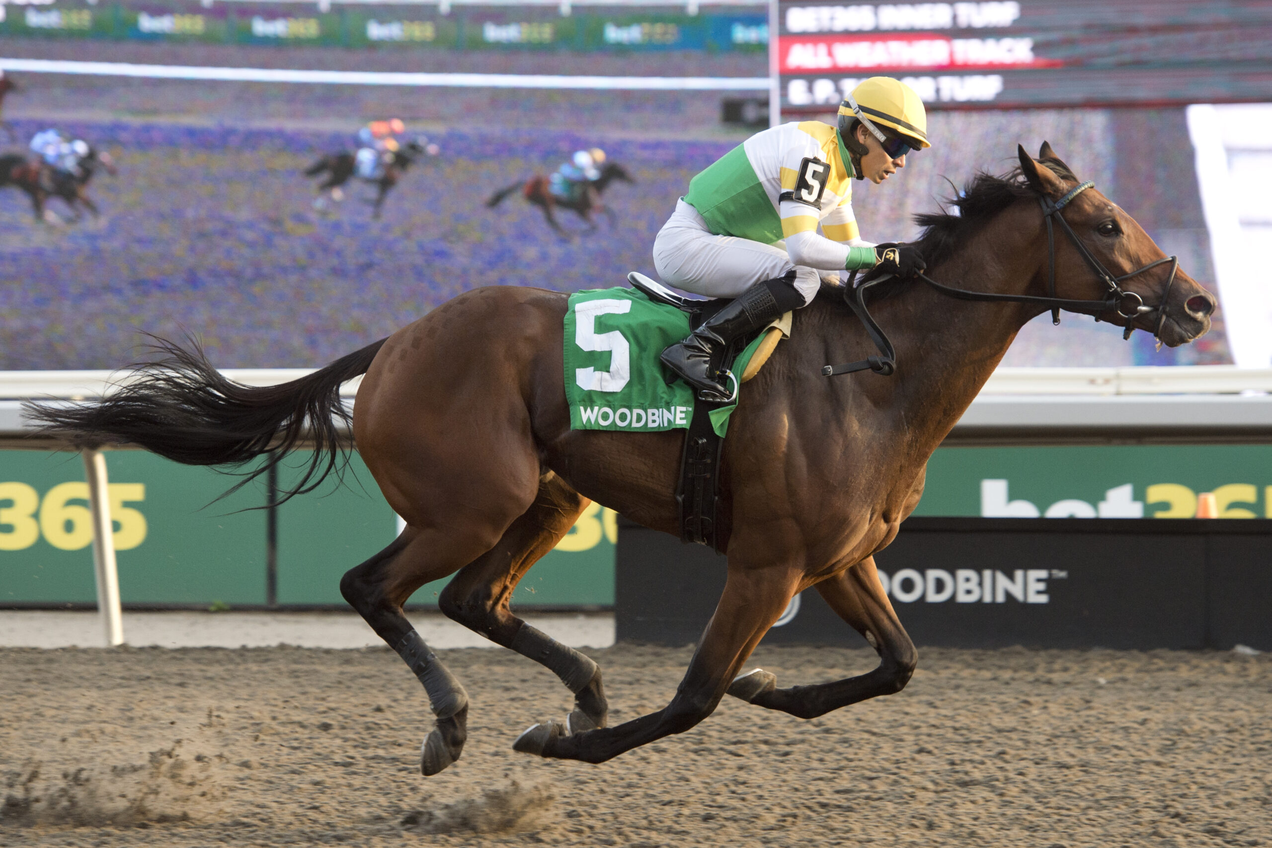 TORONTO, October 18, 2025 – Borealis Trail, under Jose Campos, was full of run late to take Saturday’s $150,000 Ontario Derby (G3) at Woodbine. Mansetti, who won The King’s Plate this August and was then second in the Prince of Wales, second jewel in the Canadian Triple Crown, broke sharply and struck front early in the 1 1/8-mile main track feature for 3-year-olds, shadowed by Runaway Again, winner of the Prince of Wales, into the first turn and through an opening panel in :24.90. Borealis Trail, a sharp second in the Breeders’ Stakes, final jewel of the Triple Crown, settled into last of seven. It was Mansetti on top by a half-length at the half in :49.43, followed by Special Session, Runaway Again and Pretty Capable, while Campos and Borealis Trail continued to watch the action from the back of the pack. Mansetti, the 2-1 choice, extended his advantage heading into the turn for home and was still on top by two lengths through three quarters in 1:13.92, but had company, in the form of a four-wide Wagstaff and an inside move from Borealis Trail straightening for home. Borealis Trail was guided off the rail in upper stretch and soon began to make inroads on the leader. Less than two lengths behind at the stretch call, the bay son of Quality Road out of the Pulpit mare Aurora Lights kept gaining with every stride and took over with 100 yards to the wire, going on notch a two-length win in his stakes breakthrough. Mansetti was second, 2 ½ lengths clear of Wagstaff. He’s Not Joking was fourth. The final time was 1:50.88. Borealis Trail and jockey Jose Campos winning the Ontario Derby on October 18, 2025 at Woodbine (Michael Burns Photo) “I think he’s an excellent horse,” praised Campos. “He’s a super horse. Rachel is doing an excellent job with the horse. He’s a difficult horse to train, and he’s doing good.” “So, I tried to save ground in the first part, and when I asked [him] to go, the horse just flew.” “It’s a little bit of redemption for him for getting beat in the in the Breeders’, the way that he did,” added trainer Rachel Halden. “Obviously, we were thrilled with how he ran, but when you’re second by just a head in a race like that, it’s a bit more frustrating than being beating fair and square by two lengths. So, it was definitely a bit of redemption for him today.” It was the second win, to go along with a second and a third from six starts, for the Chiefswood Stables homebred. “I think looking at his form, and I was kind of looking at the betting, I think everyone was sort of following that, thinking of him probably as a turf horse, because that’s when he kind of came around,” said Halden. “But if you go back to his first race here on the Tapeta, it was very solid. We just went the turf route because we were thinking about the Breeders’, but he’s proved today that he can definitely handle this surface too.” After three starts – one on the dirt at Gulfstream in April and two on the Woodbine main track, Borealis Trail, unraced at 2, broke his maiden at one mile over the E.P. Taylor turf on August 3. Sent off as the 6-1 fifth choice in the wagering, Borealis Trail paid $14.90 for the Ontario Derby win. Chris Lomon, Woodbine Share This:Share